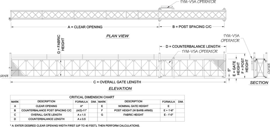 For those larger applications where security, speed, reliability, and budget are the major considerations, TYMETAL’S Box Frame Cantilever Slide Gate and TYM-VSA operator is the perfect choice. As with all featured TYMETAL gate and operator systems this gate and operator combination has been tested. Drawings and layouts are available; specifications describing the gate and operator system are available as well.